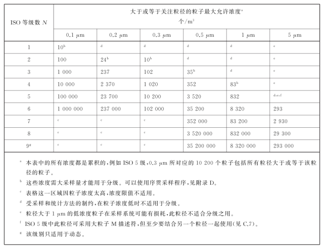 表E.1給出了所允許的非整數潔凈度等級。粒子測量上存在的不確定性使得級別增加不宜低于0.5,表中的腳注說明了由于采樣和粒子采集的局限性而帶來的限制條件。