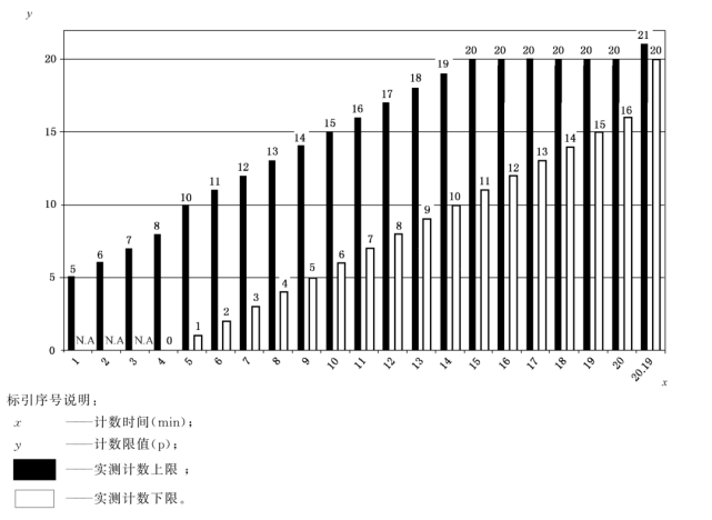 在圖 D.2 中畫出了實測計數的上下限與計數獲取時間之間的關系。其所在列表示的是在1 min 的時間間隔內的限值(上限和下限)。